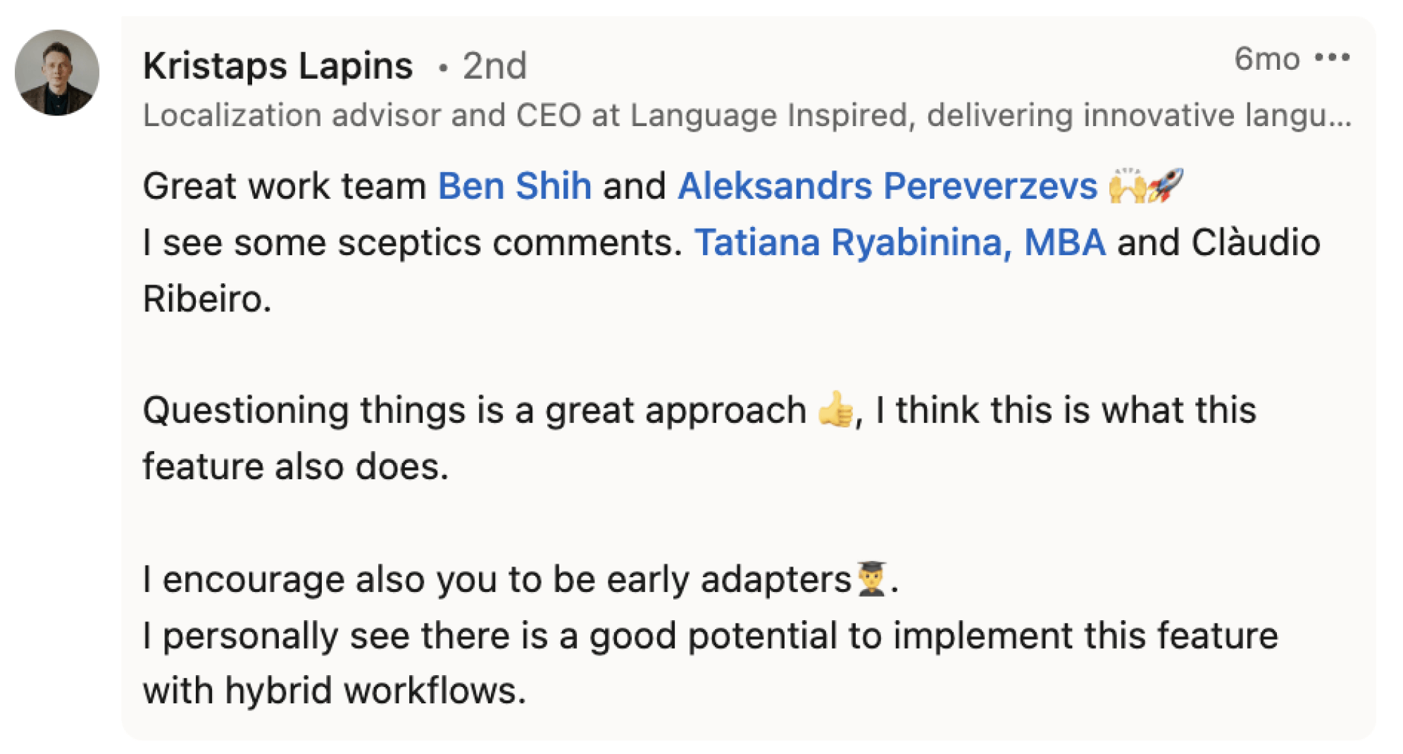 Reviewing translations is crucial for them, but it has little impact on their actual work. Therefore, they want to minimize the cost of this process as much as possible.